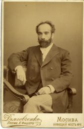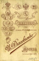 Снимок сделан фирмой Карла Фишера, перекупившего в конце 1880-х годов ателье придворного фотографа Ивана Дьяговченко на Кузнецком мосту в Москве у его наследников. Условием продажи было сохранение имени прежнего владельца. С 1895 года с бланков исчезли слова «преемник И. Дьяговченко». Теперь на каждом паспарту печаталось «Фотография К.А. Фишера, бывшая И. Дьяговченко». Выполненные в ателье снимки наклеивались на картонное паспарту, нередко с золотым обрезом и фирменной надписью по нижнему краю лицевой стороны. Оборот мог многое рассказать о фотографическом заведении. Здесь не только печатали фамилию владельца и адрес, но и размещали все регалии, в том числе медали, полученные заведением на разных выставках. Карл Андреевич Фишер с гордостью печатал с 1892 года звание – «фотограф императорских университета и театров». В 1894 году мастер стал одним из основателей Русского фотографического общества в Москве, а через несколько лет – его председателем. В ателье Фишера снимались известные художники, композиторы, писатели, артисты, в том числе И.Е. Репин, В.И. Суриков, М.А. Врубель, П.И. Чайковский, Л.Н. Толстой, А.П. Чехов, М.Н. Ермолова, В.Э. Мейерхольд и другие.