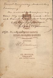 На обороте фотографии – дарственная надпись: «Князю Владимиру Михайловичу Голицыну. На память совместного служения делу призрения больных и раненых воинов в городских госпиталях. Глубоко признательный Сергей Третьяков. 1878. Ноябрь». История ее такова. В январе 1877 года С.М. Третьяков был избран московским городским головой, должность занимал четыре года, и это был значимый период его «жизни во благо общества». Начало его пребывания на посту совпало со вступлением России в войну с Турцией (1877–1878). Сергей Михайлович наладил работу городских госпиталей и не раз инициировал сбор пожертвований в пользу раненых. Тогда же и произошло «совместное служение» С.М. Третьякова и чиновника особых поручений при московском генерал-губернаторе В.А. Долгорукове князя В.М. Голицына, курировавшего этот вопрос со стороны государственной администрации, а впоследствии ставшего крупным политическим деятелем Российской империи. Интересно, что это было не единственное пересечение имен Третьяковых и Голицыных. В 1898 году, после смерти П.М. Третьякова, Московская городская дума, в ведении которой оказалась Третьяковская галерея, вынуждена была заняться вопросом ее дальнейшего устройства. Летом 1899 года было утверждено Положение об управлении галереей, по которому председателем Совета Городской галереи Павла и Сергея Третьяковых (и ее попечителем) становился московский городской голова – в то время князь Владимир Михайлович Голицын.