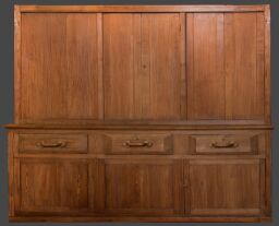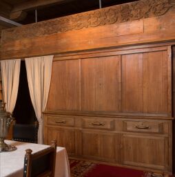 Простой сосновый буфет своей строгой и лаконичной формой гармонично дополняет интерьер столовой дома В.М. Васнецова. Единственным украшением буфета служат массивные ручки выдвижных ящиков. Отсутствие декоративной составляющей восполнено его практичностью и сказочным названием – «самобранка». Буфет, поставленный как перегородка и снабженный дверцами с обеих сторон, использовался для передачи приготовленной еды из кухни.